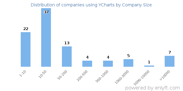 We have data on 97 companies that use YCharts. The companies using YCharts are most often found in United States and in the Financial Services industry. YCharts is most often used by companies with 10-50 employees and 1M-10M dollars in revenue. Our data for YCharts usage goes back as far as 8 years and 2 months.