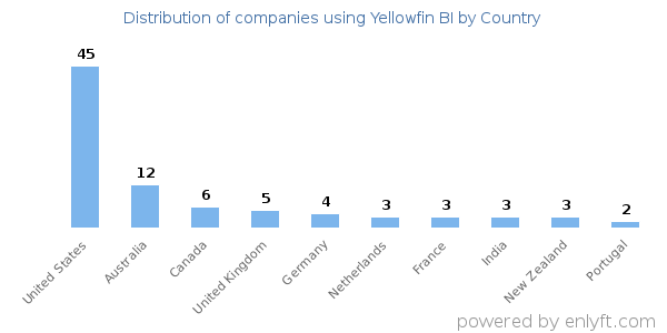 We have data on 106 companies that use Yellowfin BI. The companies using Yellowfin BI are most often found in United States and in the Information Technology and Services industry. Yellowfin BI is most often used by companies with 50-200 employees and 1M-10M dollars in revenue. Our data for Yellowfin BI usage goes back as far as 8 years and 6 months.