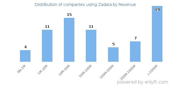 We have data on 78 companies that use Zadara. The companies using Zadara are most often found in United States and in the Information Technology and Services industry. Zadara is most often used by companies with 50-200 employees and >1000M dollars in revenue. Our data for Zadara usage goes back as far as 3 years.