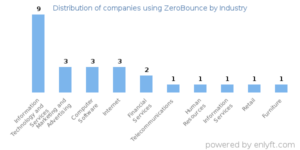 We have data on 28 companies that use ZeroBounce. The companies using ZeroBounce are most often found in United States and in the Information Technology and Services industry. ZeroBounce is most often used by companies with 50-200 employees and 10M-50M dollars in revenue. Our data for ZeroBounce usage goes back as far as 1 years and 8 months.