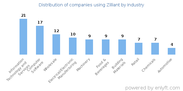 We have data on 186 companies that use Zilliant. The companies using Zilliant are most often found in United States and in the Information Technology and Services industry. Zilliant is most often used by companies with >10000 employees and >1000M dollars in revenue. Our data for Zilliant usage goes back as far as 5 years and 8 months.
