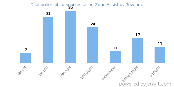 Of all the customers that are using Zoho Assist, 47% are small (<$50M), 23% are medium-sized and 20% are large (>$1000M).
