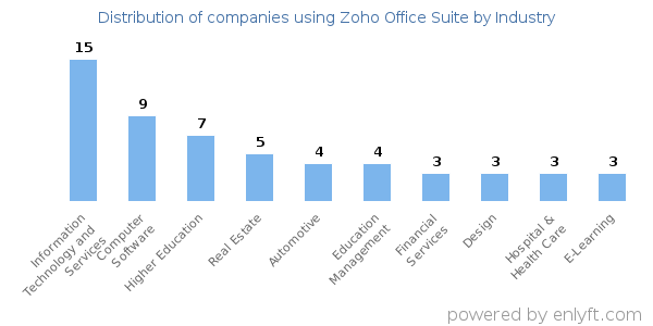 Looking at Zoho Office Suite customers by industry, we find that Information Technology and Services (12%), Computer Software (7%) and Higher Education (5%) are the largest segments.