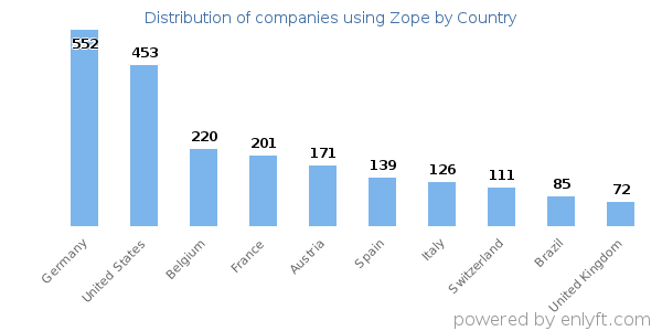 18% of Zope customers are in Germany, 15% are in United States, 7% are in Belgium, 7% are in France and 6% are in Austria.